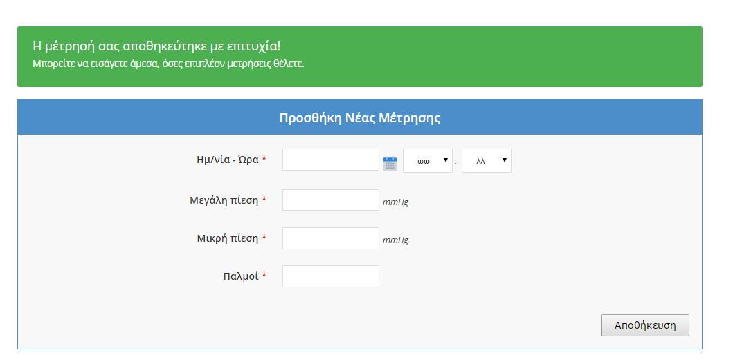 Για την εισαγωγή νέων μετρήσεων πίεσης εισάγετε τις τιμές στα προβλεπόμενα πεδία και πατάτε το κουμπί «ΑΠΟΘΗΚΕΥΣΗ» ώστε να αποθηκευτούν στο φάκελό σας.