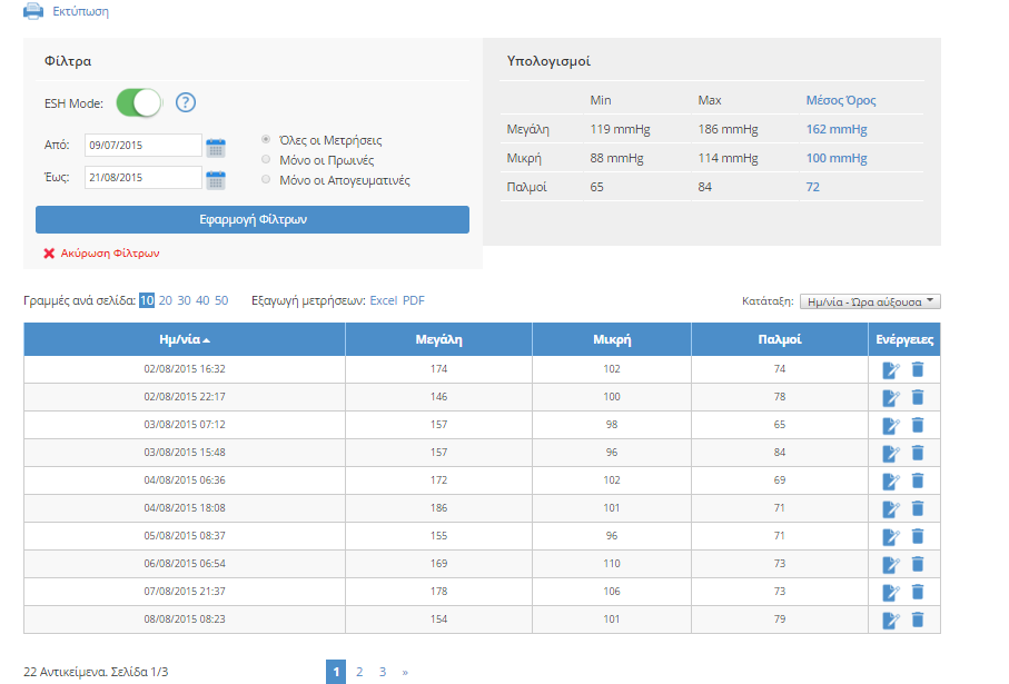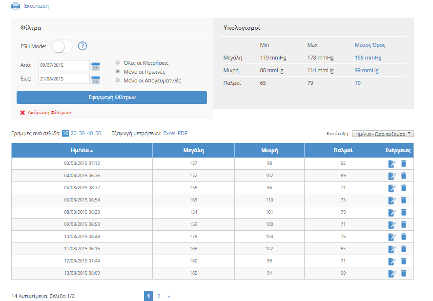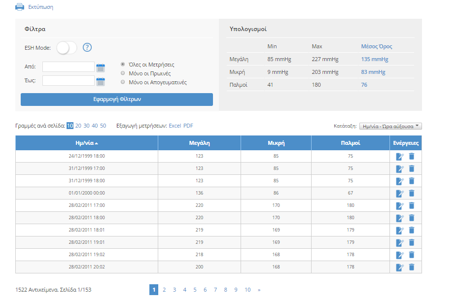 Στην περιοχή αυτή μπορείτε να δείτε το σύνολο των μετρήσεων που έχετε εισάγει έως τώρα. Η υπηρεσία υπολογίζει αυτόματα το Μέσο Όρο την Ελάχιστη και Μέγιστη μέτρηση ανάμεσα στο σύνολο των μετρήσεων.