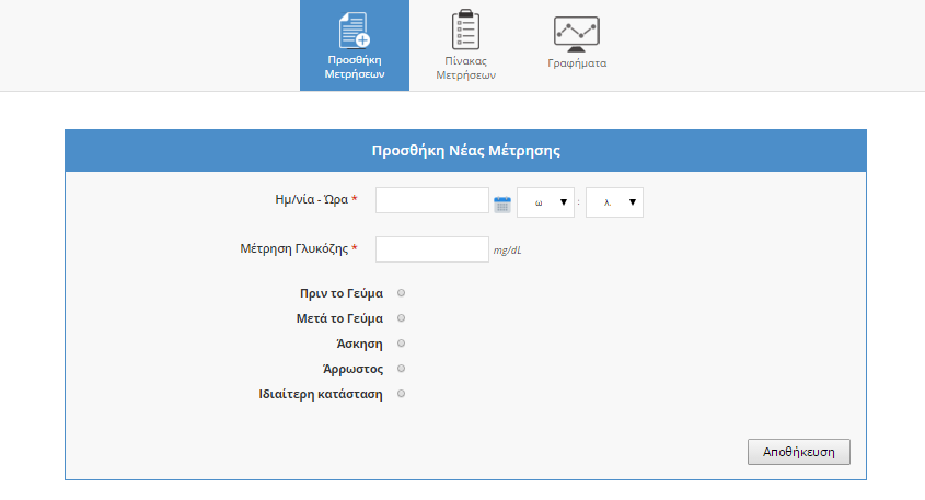 Αφού πατήσετε το κουμπί «ΔΙΑΧΕΙΡΙΣΗ ΜΕΤΡΗΣΕΩΝ ΣΑΚΧΑΡΟΥ» τότε προκύπτει το παρακάτω μενού επιλογών: