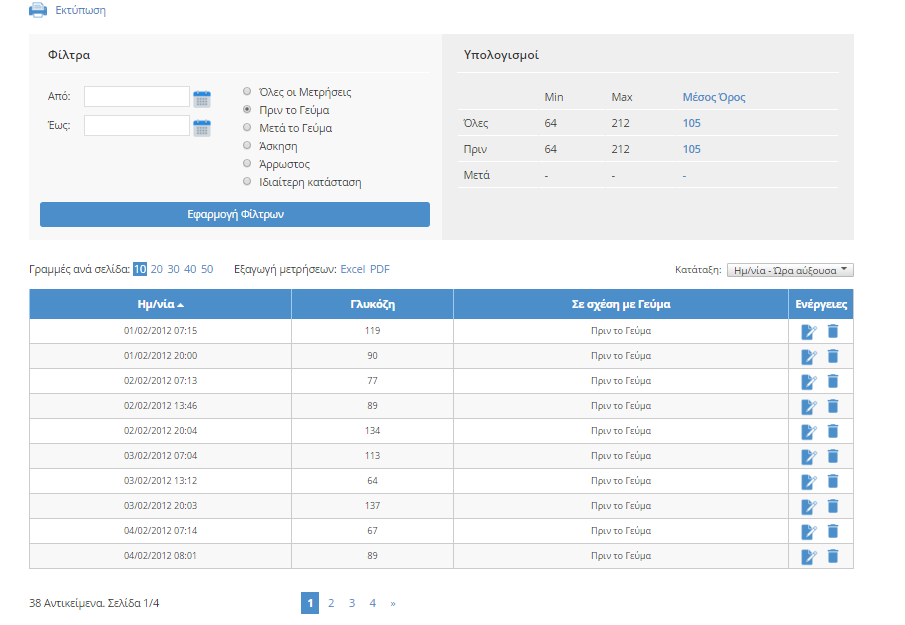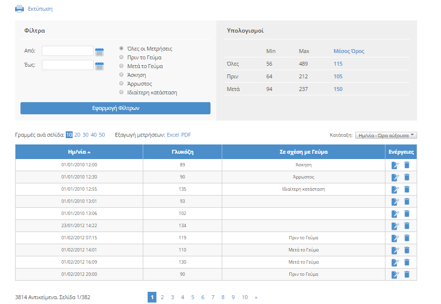 Στην περιοχή αυτή μπορείτε να δείτε το σύνολο των μετρήσεων που έχετε εισάγει έως τώρα. Η υπηρεσία υπολογίζει αυτόματα το Μέσο Όρο την Ελάχιστη και Μέγιστη μέτρηση ανάμεσα στο σύνολο των μετρήσεων.