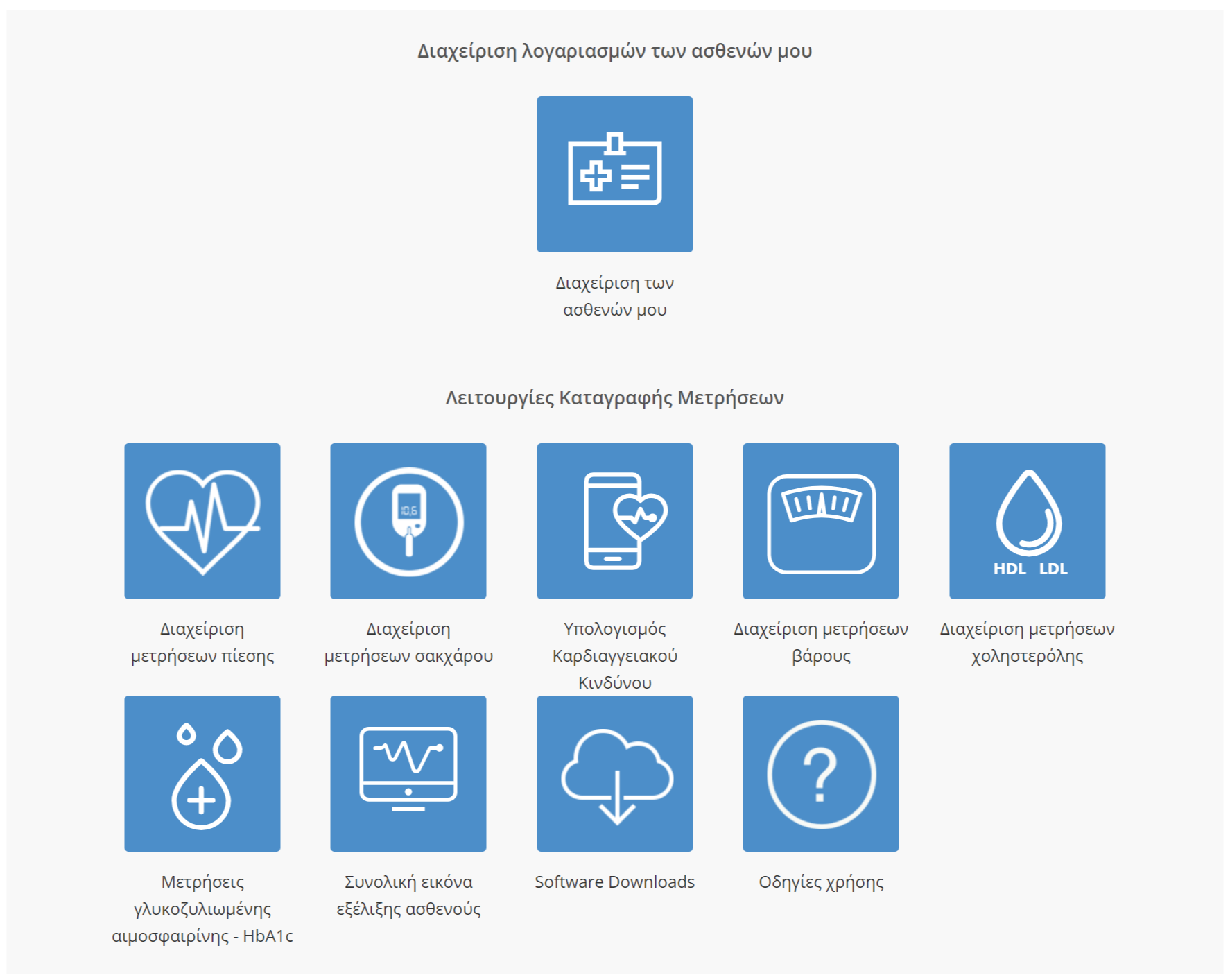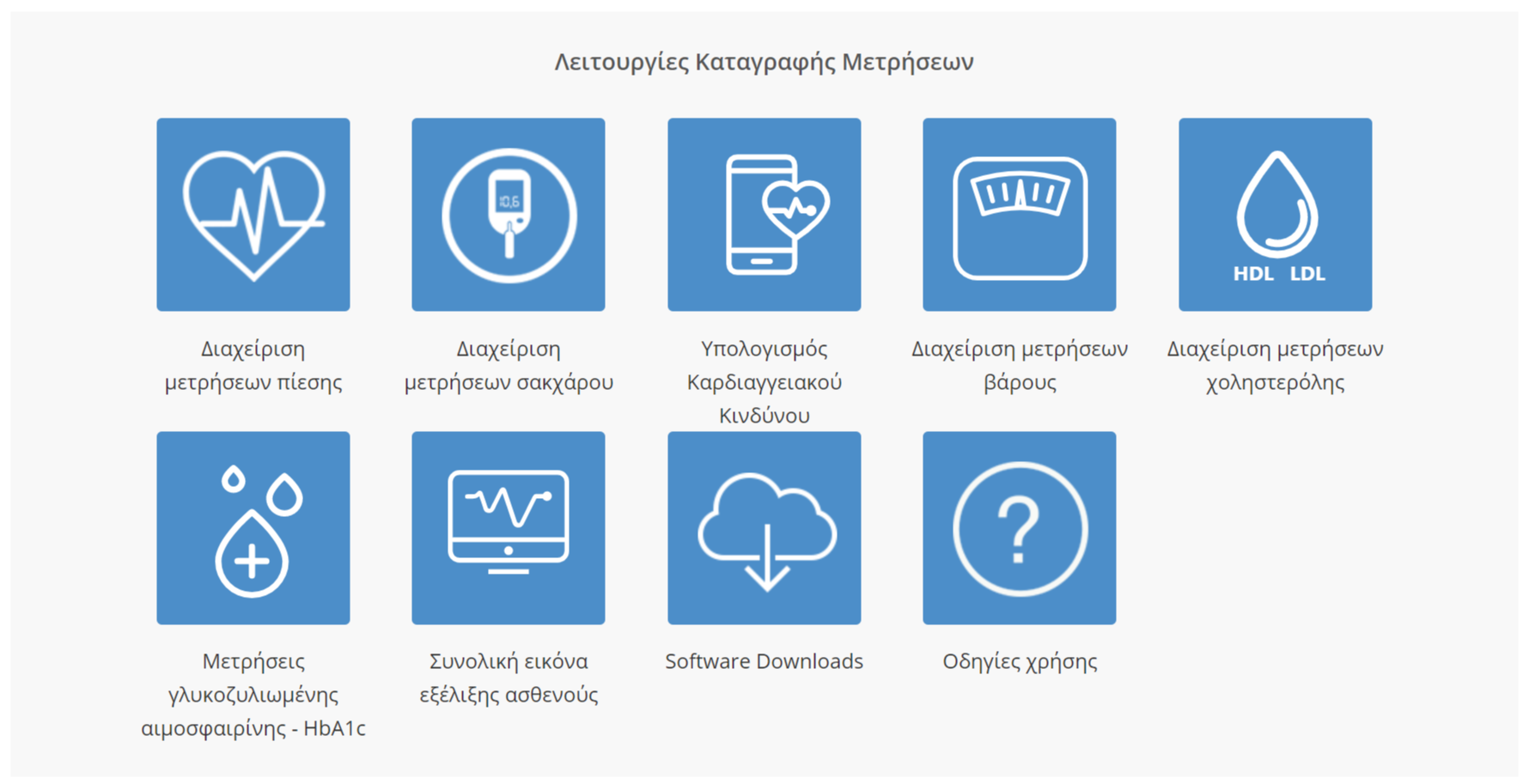 Με την επιτυχή σύνδεσή σας στο Hypertension & Diabetes Corner θα μπείτε στο κεντρικό μενού της καταγραφής μετρήσεων και θα δείτε τις παρακάτω ενέργειες.